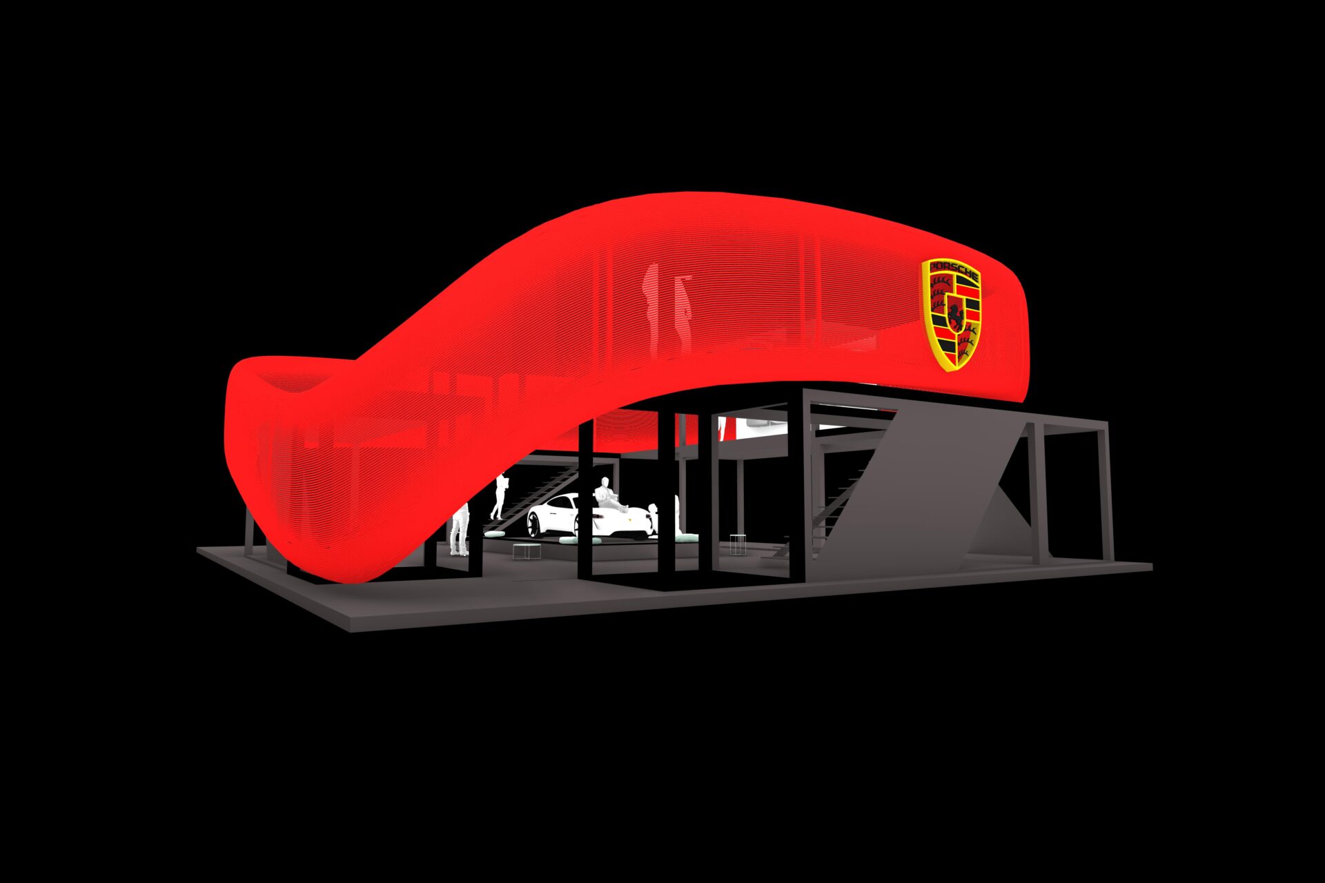 A modular exhibition system developed for the Porsche brand, designed to embody movement, precision, and the visceral experience of speed. The pavilion is built around a container core, enveloped by a sculptural outer shell that interprets the dynamic flow of a road in motion. Its form translates acceleration into spatial rhythm—fluid, directional, and inherently interactive. Visitors are invited to engage with the installation through playful, tactile elements that bring the concept of performance to life. The signature Porsche red serves as a visual anchor, symbolizing energy, passion, and the brand’s racing heritage.